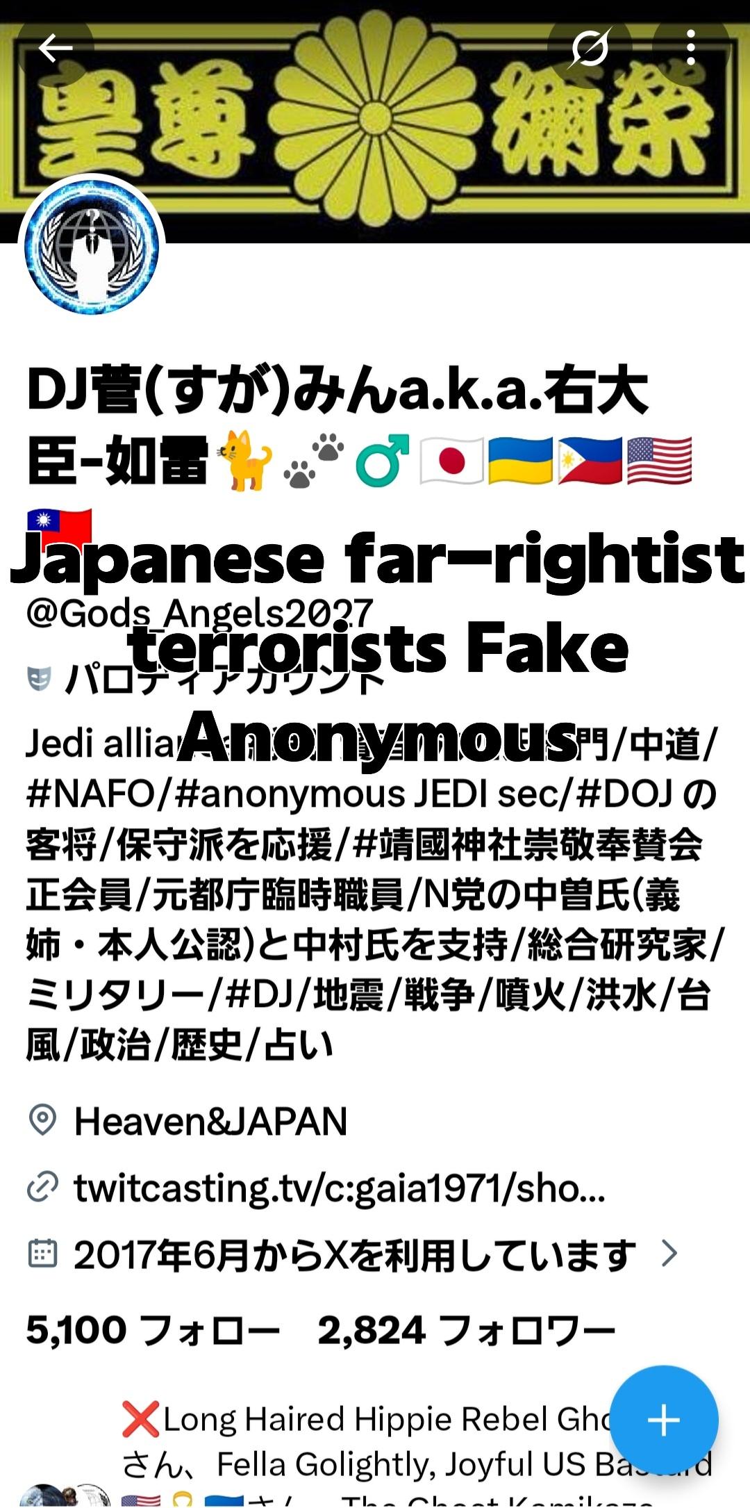 "content": "Japanese far-rightist terrorists group \nFake Anonymous accounts. Not #NAFO #Racist #Fascist #Japan\n\nhttps://kolektiva.social/system/media_attachments/files/115/833/117/170/626/598/original/2a25fbe9708946a7.jpg",